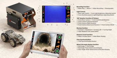 The tablet controls the all-metal-bodied robot as it moves freely into the sewer to probe, and the 360-degree rotating camera monitors what's happening inside the pipes from a dead-end angle.