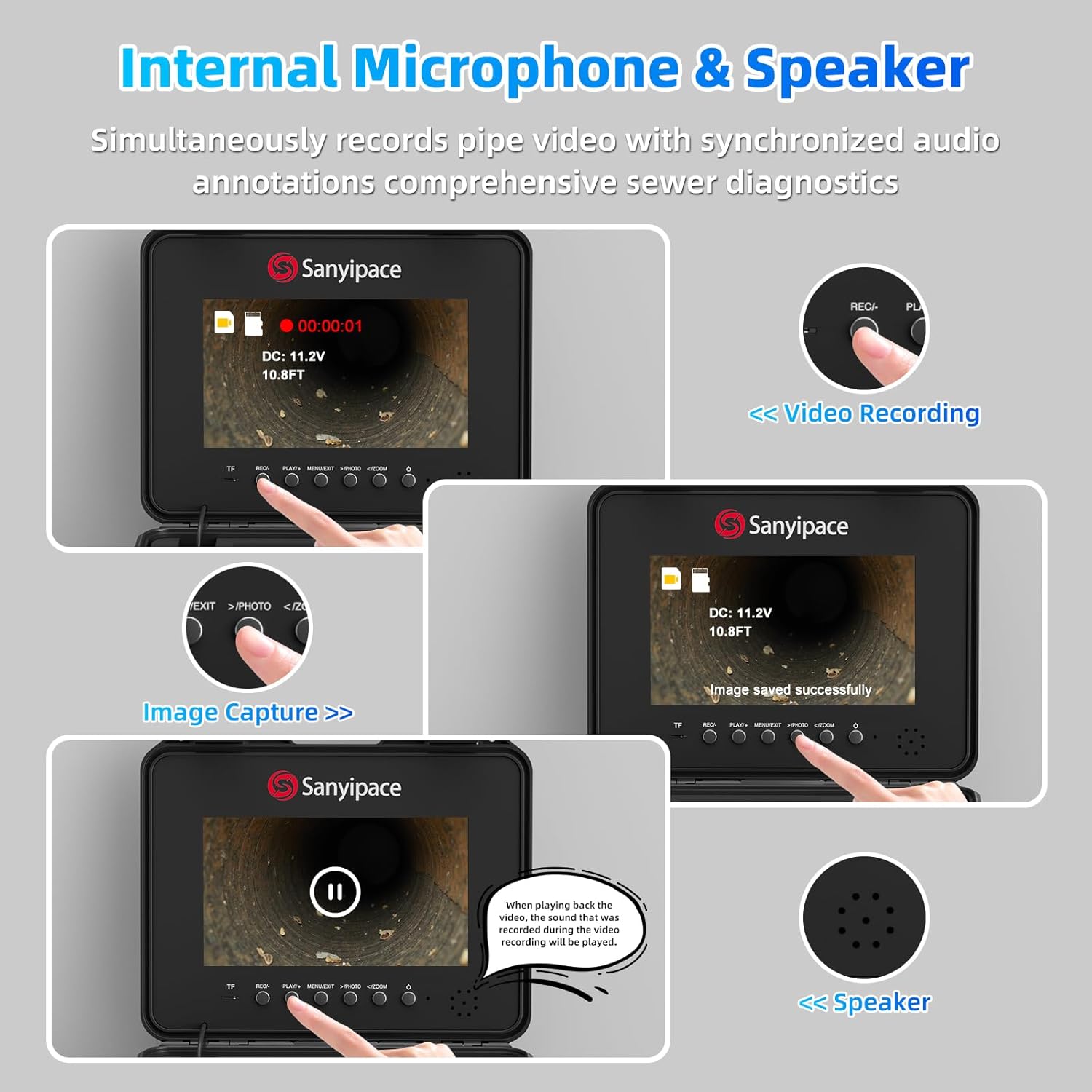 Diese Funktion wurde entwickelt, um die Möglichkeiten Ihrer Abfluss- und Rohrleitungskamera zu erweitern und erleichtert die mündliche Dokumentation von Befunden, die Erteilung von Anweisungen oder das Hervorheben kritischer Punkte während einer Live-Inspektion. Sie ist besonders wertvoll für professionelle Sanitär- und Entwässerungsdienstleistungen, wo präzise Kommunikation unerlässlich ist.