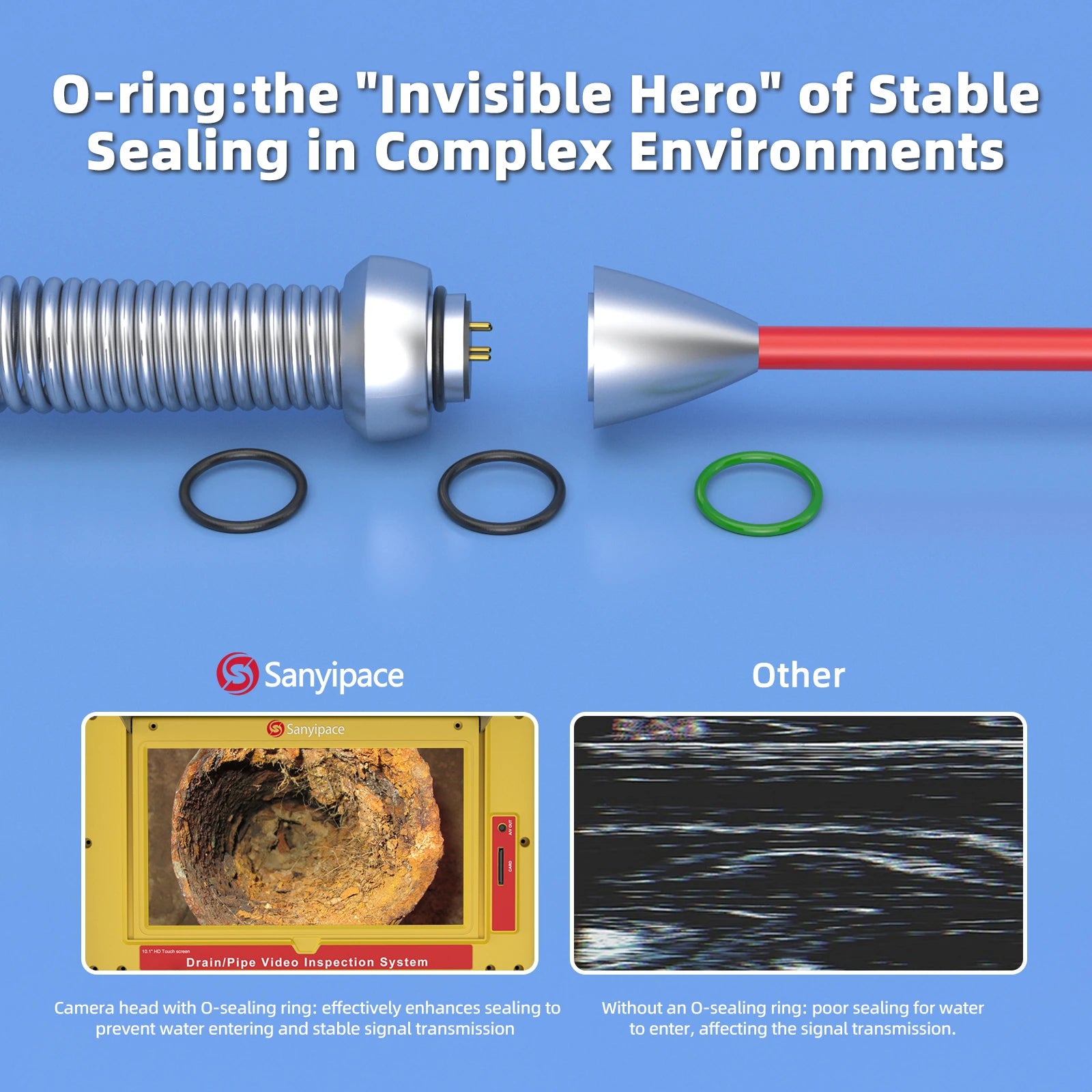 Tips: This camera head will be only compatible with the Sanyipace S610ASMKTCP sewer camera, and there will be two versions of the camera head, one with a black waterproof O-ring and one with a green waterproof O-ring. (Please confirm your sewer camera model and waterproof O-ring color before purchase; if you are not sure, please feel free to contact our customer service for consultation.)