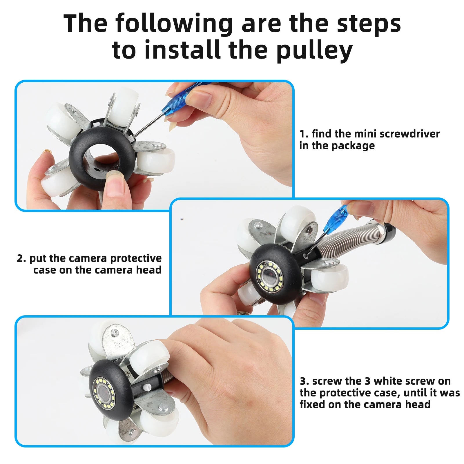 The pipeline pulley is an important part of general maintenance and replacement spare parts and is suitable for Sanyipace's various types of pipes and sewer pipe inspection cameras. The camera head diameter after the guide wheel is installed is 3.54 inches/90mm. When installed with the equipped guide wheel, the camera head can pass through straight pipelines with diameters greater than 3.74 inches/95mm
